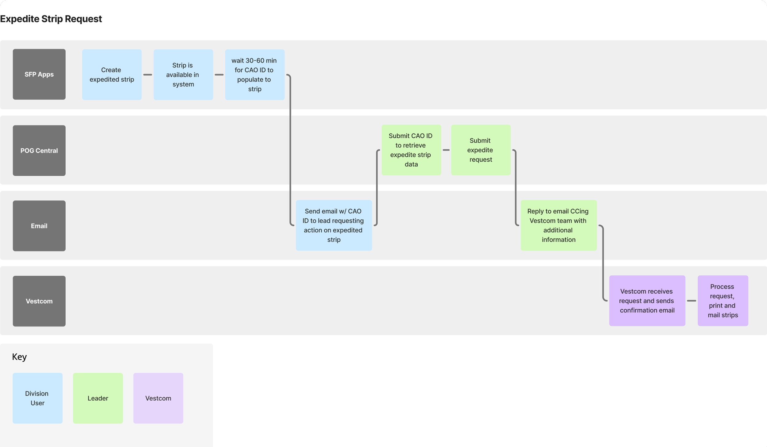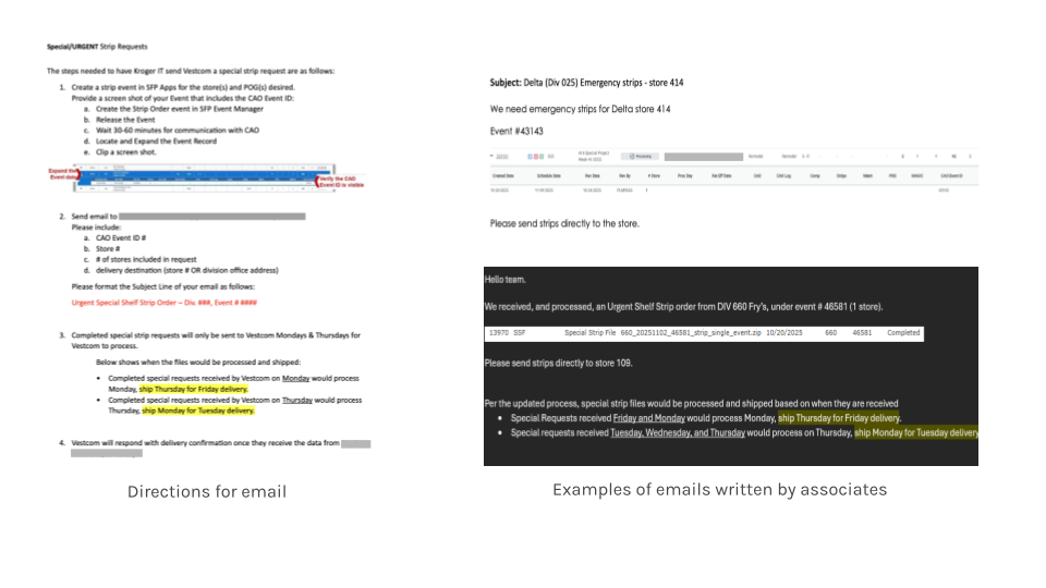 The expedite shelf strip workflow spanned multiple systems and relied heavily on email coordination. As a result, the workflow was extremely manual, time-consuming, and error-prone.