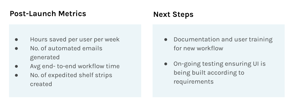While the workflow is currently in stage, we are excited for the outcomes that this update will provide when launched to in production. The primary metrics we anticipate tracking post-launch include hours saved per user per week, number of automated emails generated, average end to end workflow time, and number of expedited shelf strips created.